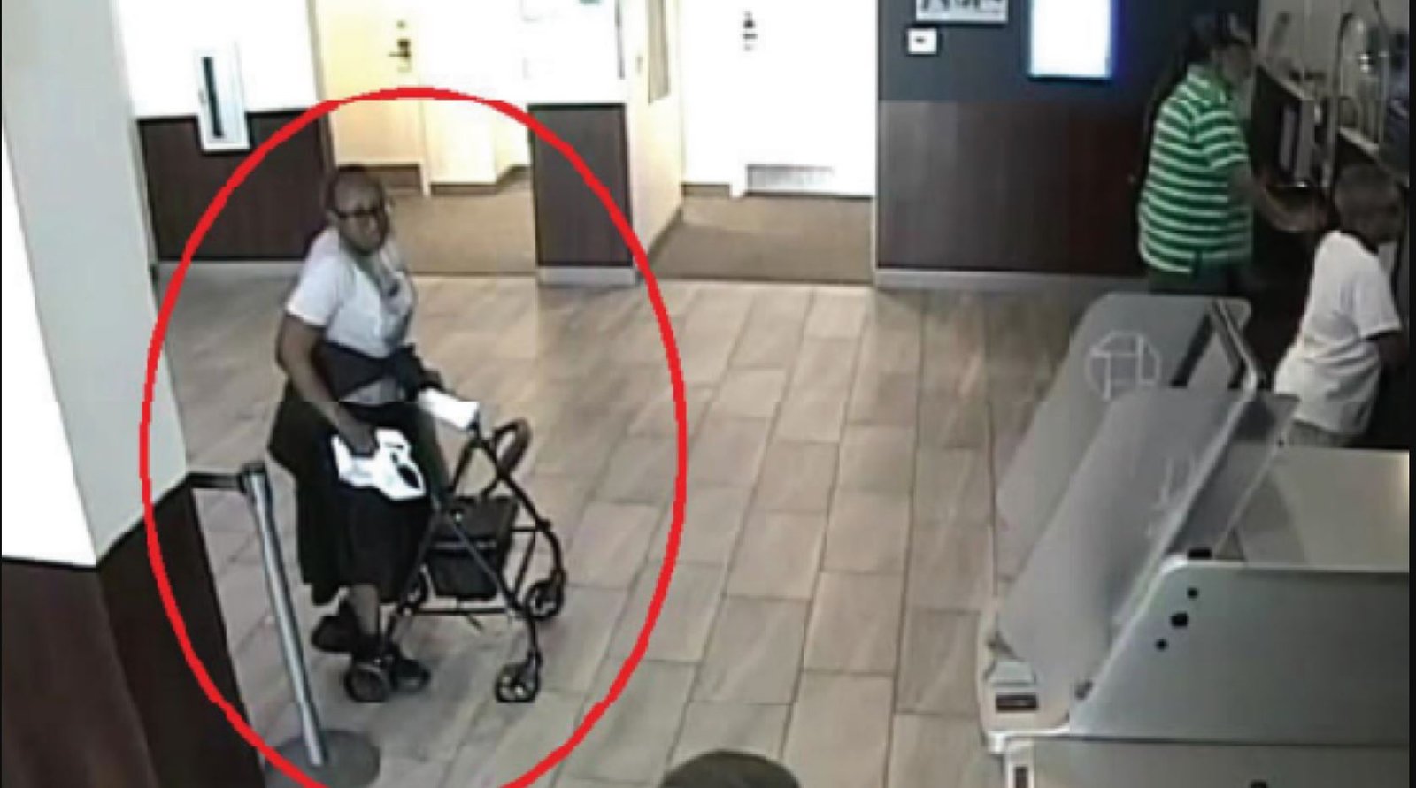 والتقطت كاميرا أمنية صورًا لهاملتون وهي تنتظر دورها وهي مستندة لعربة مساعدة على المشي بأربع عجلات.