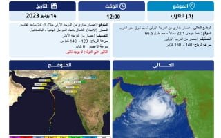 توقع المركز الوطني للأرصاد أن تتحول “ العاصفة المدارية” في بحر العرب على السواحل الهندية – الباكستانية إلى منخفض مداري – منخفض جوي خلال الـ 12 ساعة القادمة ثم منخفض جوي ثم انتهاء الحالة المدارية عند اتجاهه إلى الشمال – شمال شرق، حيث تتراوح سرعة الرياح حول المركز 40 – 60 كم/ س وسرعة تحركه 12 كم/ س. وكان المركز صنف الحالة المدارية في بحر العرب” عاصفة مدارية ” على السواحل الهندية – الباكستانية ، عند خط عرض 23.5 شمالاً – خط طول 69.9 شرقاً، وتبلغ سرعة الرياح حول المركز من 65 إلى 75 كم/الساعة، مع وجود تشكيلات من السحب الركامية الممطرة حول العاصفة مؤكدا عدم وجود أي تأثير على الدولة.
