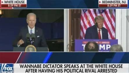وكتبت «فوكس نيوز» في شريط الأنباء: «دكتاتور ناشئ يتحدث في البيت الأبيض بعد أن أوقف منافسه السياسي»، فيما كانت الشاشة منقسمة إلى شطرين، يظهر أحدهما بايدن يتحدث من مقر الرئاسة، ويظهر الآخر ترامب أمام أنصاره في أحد ملاعب الغولف التي يملكها في نيوجيرسي.