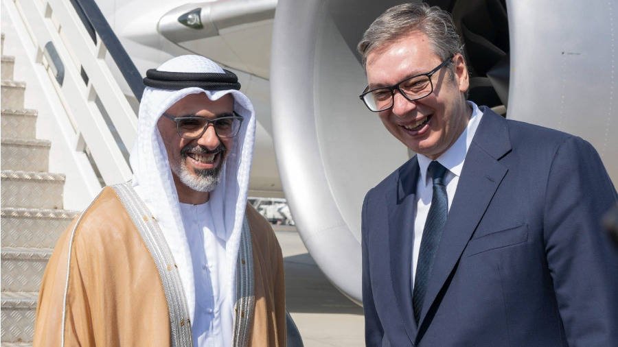 خالد بن محمد بن زايد يصل بلغراد والرئيس الصربي يتقدم مستقبليه