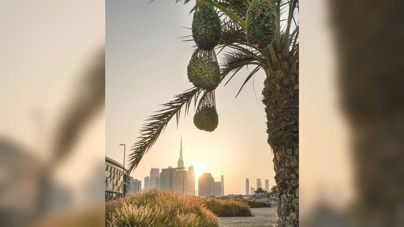 بشائر الخير تتدلى، وعناقيد التمور الوفيرة تقترب من اكتمال الحلاوة وموسم الجني، ليزين النخيل – أحد رموز الأصالة والهوية – حي دبي للتصميم، الوجهة العصرية في قلب المدينة، ويطلّ على أفق يحرسه برج خليفة، في لحظة ترحل فيها الشمس، وتلون الأجواء بسحر غروبها.