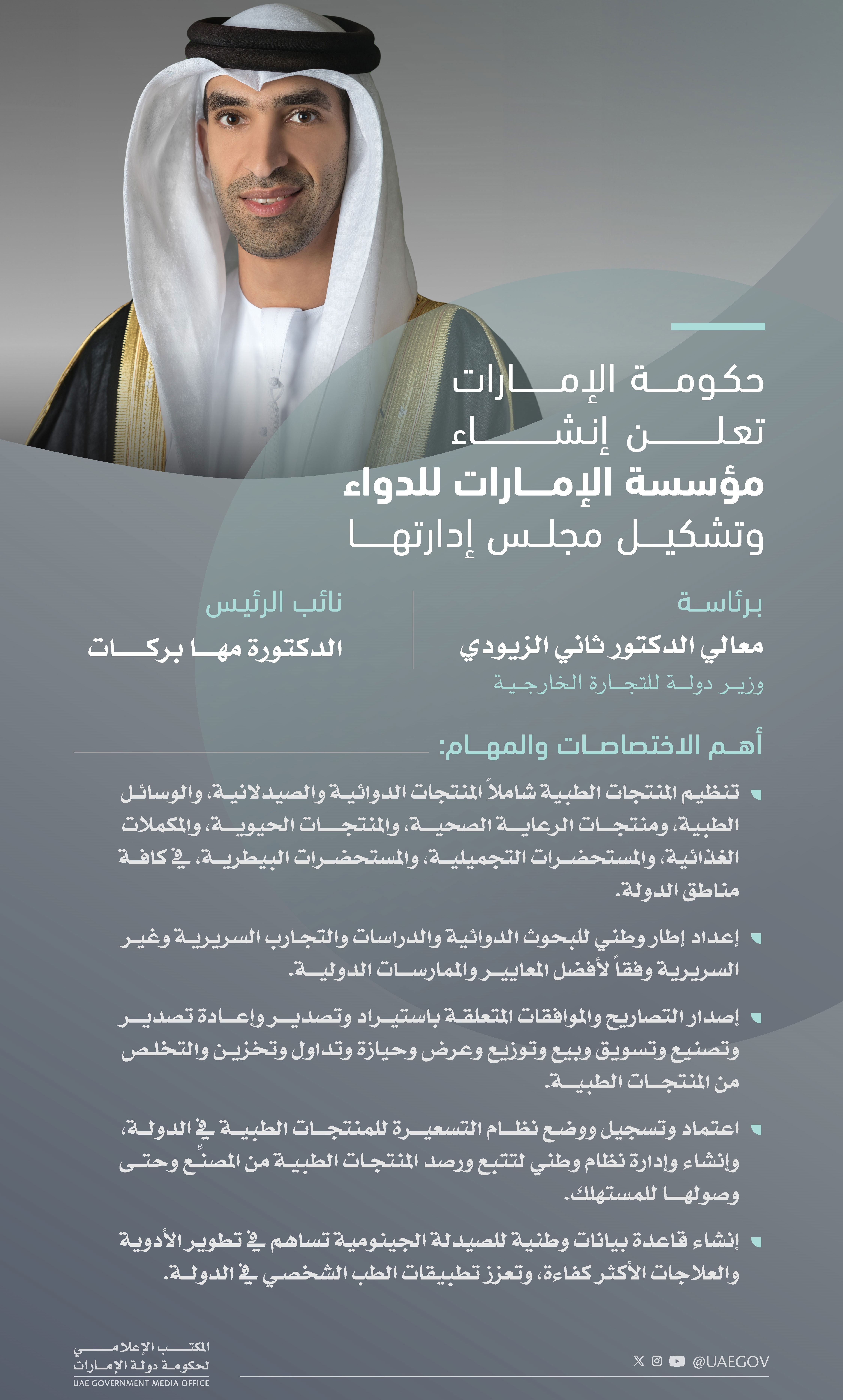 وأضاف سموه: «واعتمدت حكومة الإمارات أيضاً تعيين ثاني الزيودي رئيساً لمجلس إدارة مؤسسة الإمارات للدواء، ونائبته الدكتورة مها بركات، والمؤسسة الجديدة هي المعنية بتنظيم وترخيص كافة المنتجات الطبية والدوائية والصيدلانية والزراعية ومستحضرات التجميل والمنتجات الحيوية وغيرها، وإنشاء وإدارة نظام وطني لتتبع المنتجات الطبية من المصنع حتى المستهلك، ضماناً لجودتها وحفاظاً على الصحة العامة لأفراد المجتمع».
