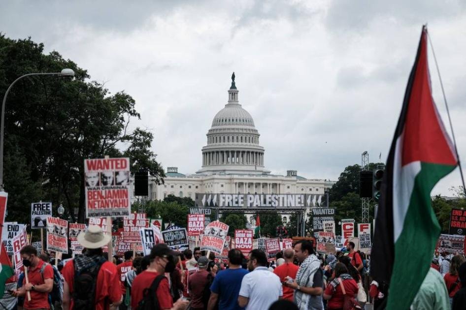 وفي الأثناء، نظم نشطاء احتجاجات حاشدة، بينما جرى تطويق مبنى الكابيتول بسياج عالٍ وأفراد شرطة إضافيين، كما أغلقت العشرات من شوارع واشنطن. وكانت شرطة مبنى الكونغرس قد اعتقلت في وقت سابق نشطاء يهود خلال احتجاجهم على الدعم العسكري الأمريكي لإسرائيل. وفي الاحتجاج الذي نظمته جماعة «الصوت اليهودي من أجل السلام» ارتدى المتظاهرون قمصاناً حمراء كتب عليها عبارات «ليس باسمنا» و«اليهود يقولون توقفوا عن تسليح إسرائيل». وحمل البعض لافتات كتب عليها «وقف إطلاق النار الآن»، و«دع غزة تعيش». وقالت جماعة الصوت اليهودي من أجل السلام في منشور على وسائل التواصل الاجتماعي: «على مدى الأشهر التسعة الماضية، شهدنا فظائع لا حصر لها في غزة، ارتُكبت باسمنا وموّلتها حكومتنا». وقالت الجماعة إن أكثر من 250 متظاهراً اعتقلوا من بين 400 شاركوا في الاحتجاج.