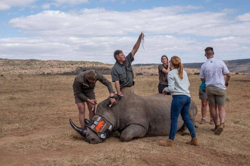 وتتجوّل حيوانات نو وخنازير ثؤلولية وزرافات في المنطقة المحمية الشاسعة، فيما يجري الفريق عملية بشكل دقيق على وحيد قرن آخر.