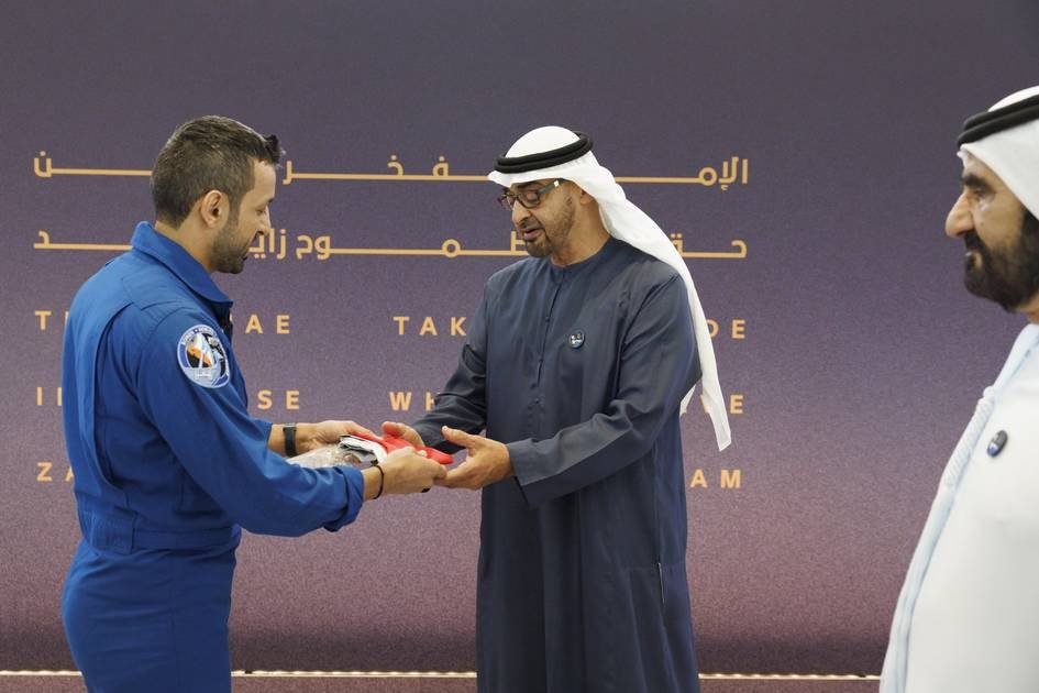 استقبل صاحب السمو الشيخ محمد بن زايد آل نهيان، رئيس الدولة، حفظه الله، وصاحب السمو الشيخ محمد بن راشد آل مكتوم، نائب رئيس الدولة رئيس مجلس الوزراء حاكم دبي، رعاه الله، رائد الفضاء الإماراتي سلطان النيادي، بعد وصوله إلى أرض الوطن.
