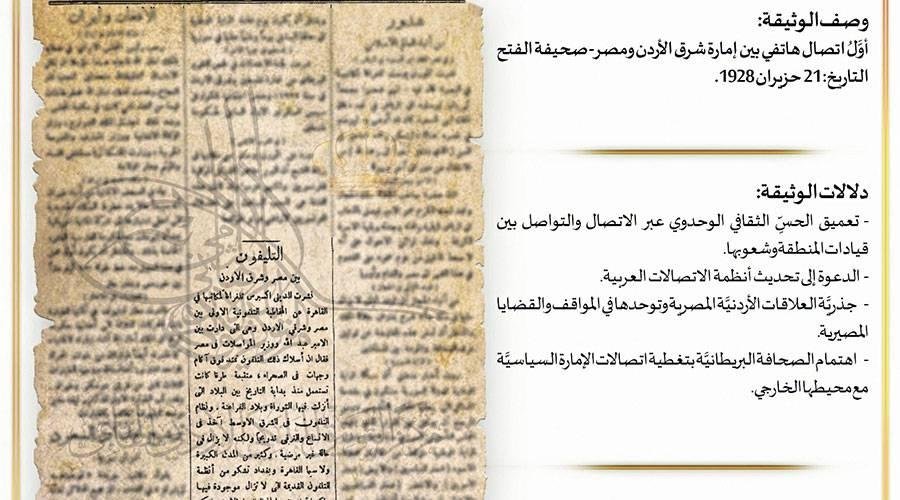 وعرض مركز التوثيق الملكي الأردني، وثيقة تضمنت خبراً من صحيفة «الفتح» في عددها 101 الصادر في 21 يونيو/ حزيران عام 1928 نقلاً عن تلغراف لصحيفة «The Daily Express» يُبيّن إجراء الاتصال حينها بين إمارة شرق الأردن ومصر.
