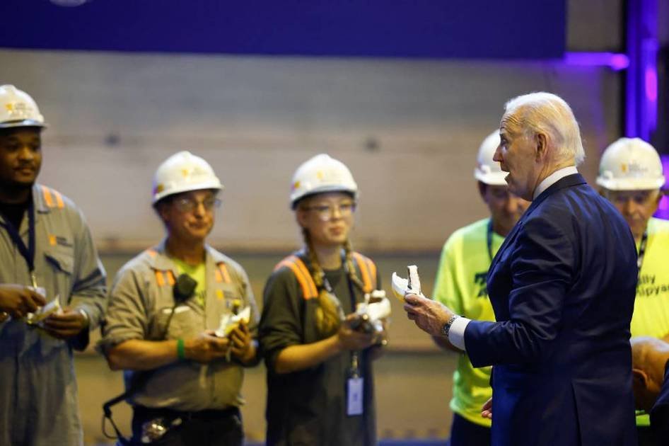 شوهد الرئيس الأمريكي جو بايدن، الخميس، وهو يوزع شطائر الآيس كريم على عمال بناء السفن خلال زيارة إلى حوض بناء…