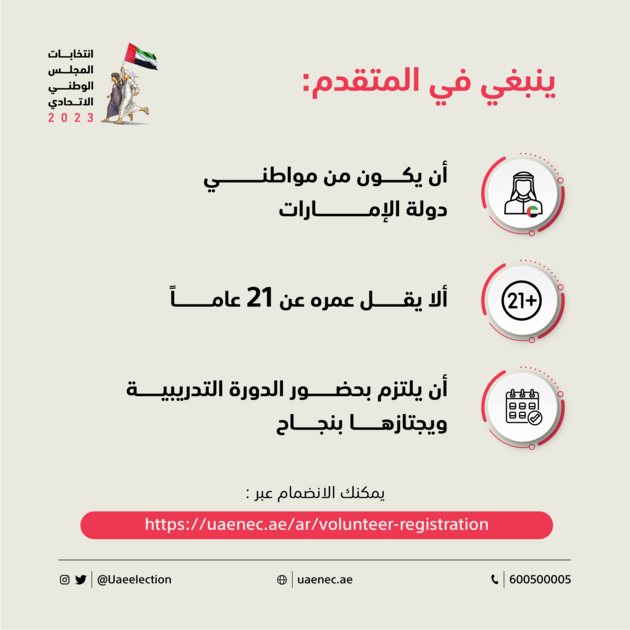 أبوظبي:«الخليج» دعت اللجنة الوطنية للانتخابات المواطنين والمواطنات إلى المشاركة في تنظيم عملية التصويت في مراكز الانتخاب الموزعة على مستوى إمارات…