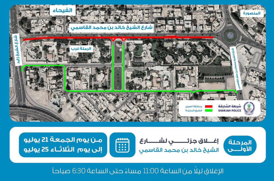 إغلاق جزئي لشارع خالد بن محمد القاسمي بدءاً من الغد