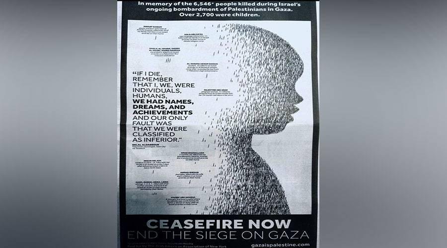 إعلان معبر عن ضحايا قصف غزة في «نيويورك تايمز»