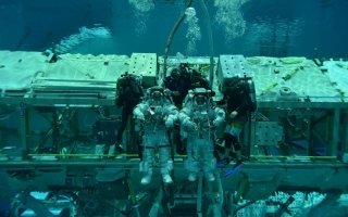 نورا المطروشي ومحمد الملا يخوضان تدريبات السير في الفضاء داخل مختبر الطفو المحايد التابع لـ”ناسا”